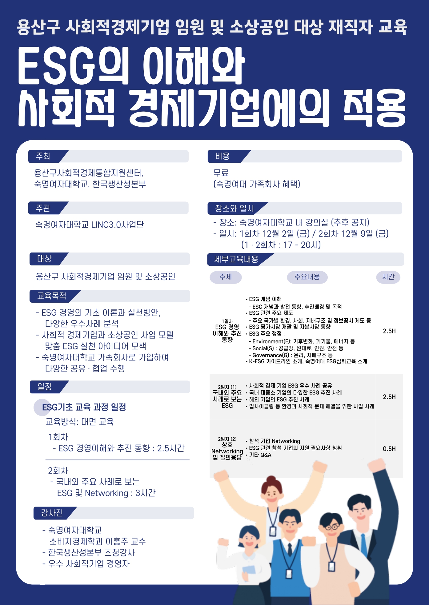 [교육] 「ESG의 이해와 사회적 경제기업에의 적용」 일시 2022-12-02 ~ 2022-12-09 주최/주관 용산구사회적경제통합지원센터, 숙명여자대학고, 한국생산성본부 장소 숙명여자대학교 모집기간 2022-11-23 ~ 2022-12-01 참가비 0원 관련 URL 신청/문의 이메일 yse.or.kr 신청/문의 전화 02-318-5200 짧은주소 https://sehub.net/jfFGO 용산구 사회적경제기업 임원 및 소상공인 대상 재직자 교육 「ESG의 이해와 사회적 경제기업에의 적용」 ▶ 교육 신청링크 : https://forms.gle/x6BtATbUiuykoNTa9 수정 댓글이 닫혀있습니다.
