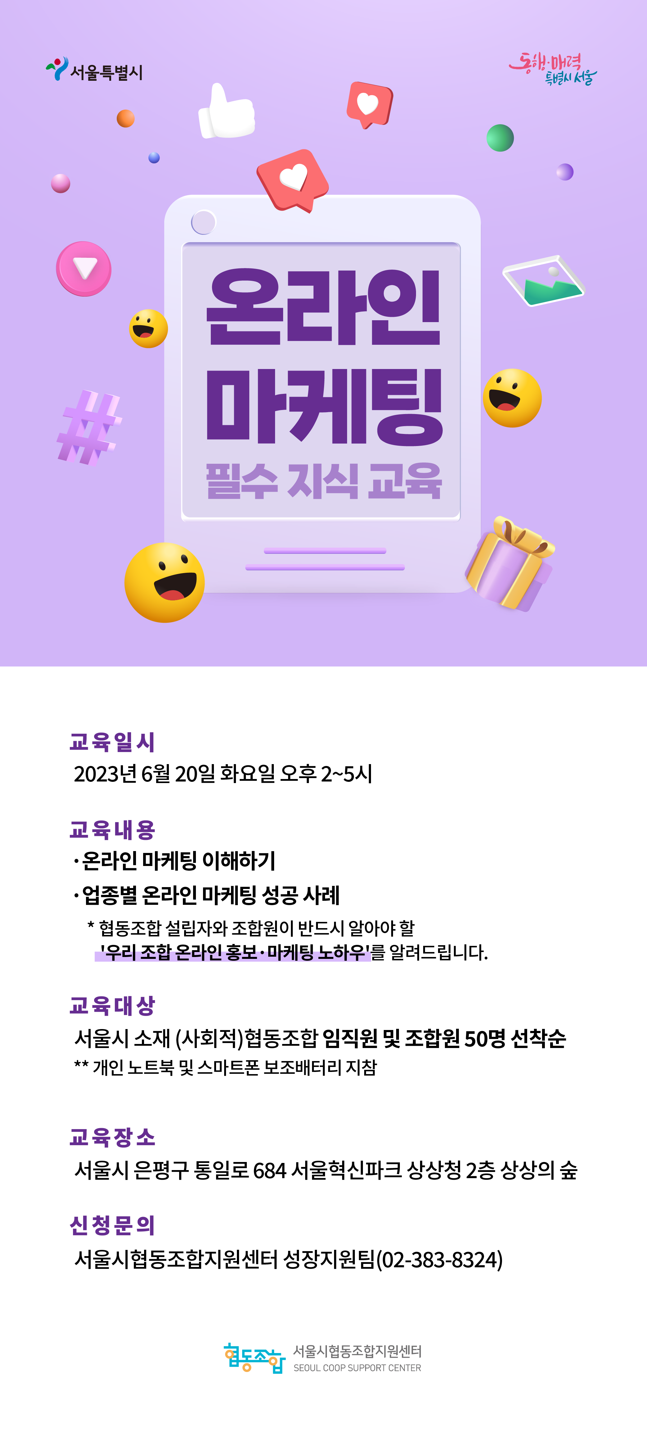 [교육] 협동조합 온라인 마케팅 필수지식 (~6.19.) 일시 2023-06-20 주최/주관 서울시협동조합지원센터 장소 서울혁신파크 상상청 2층 상상의 숲 모집기간 2023-06-05 ~ 2023-06-19 참가비 0원 관련 URL 신청/문의 이메일 lovecoop2@15445077.net 신청/문의 전화 02-383-8324 짧은주소 https://sehub.net/x4fgk 2023년 협동조합 온라인 마케팅 필수 지식교육 신청 URL ▽ https://www.15445077.net/fe/bbs/NR_view.do?bbsCd=17&bbsSeq=7949¤tPage=1&rowPerPage=10&EDU_STATUS=&searchKey=5000&searchVal= 감사합니다. 수정 댓글이 닫혀있습니다.