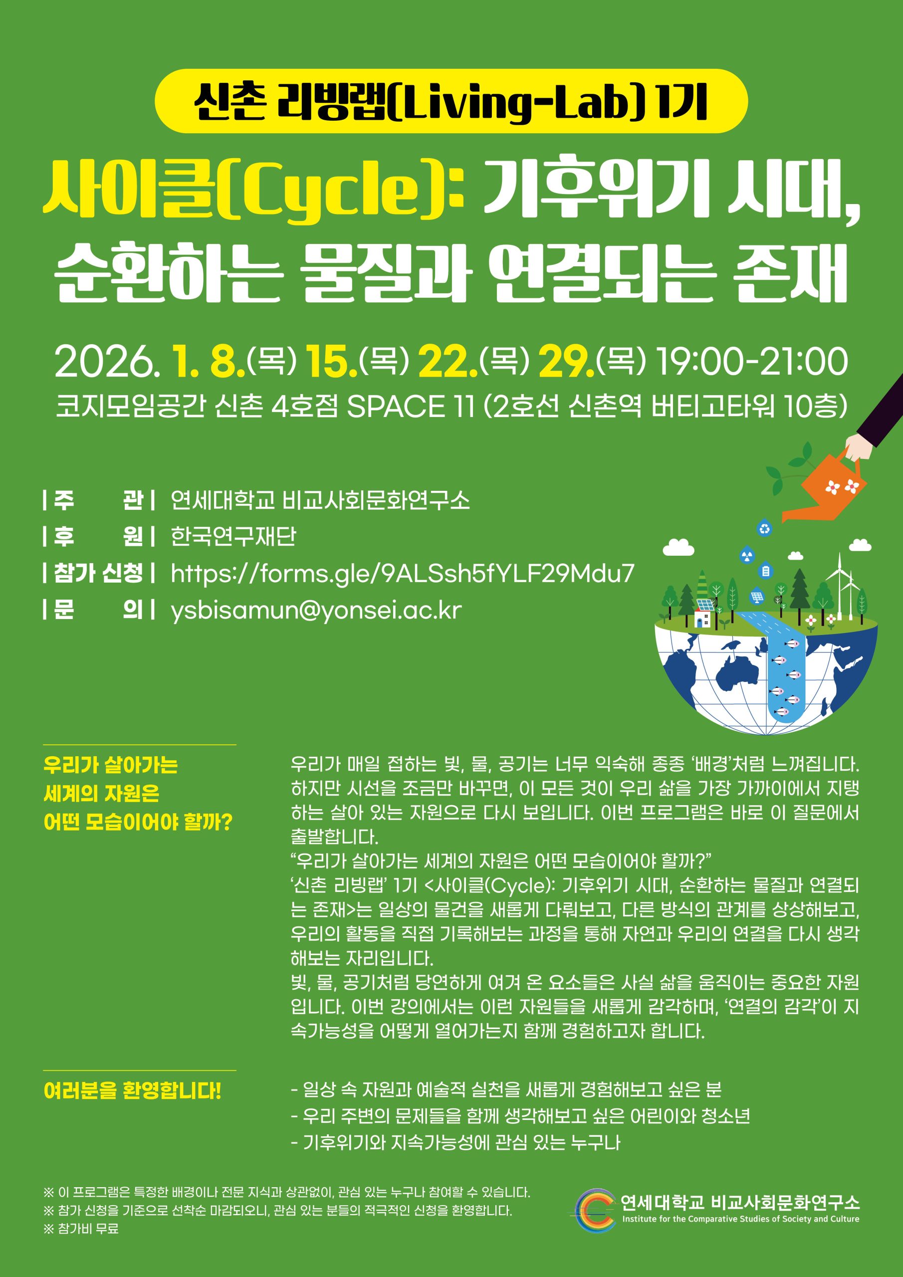 ‘신촌 리빙랩’ 1기 <사이클(Cycle): 기후위기 시대, 순환하는 물질과 연결되는 존재>는 일상의 물건을 새롭게 다뤄보고, 다른 방식의 관계를 상상해보고, 우리의 활동을 직접 기록해보는 과정을 통해 자연과 우리의 연결을 다시 생각해보는 자리입니다.