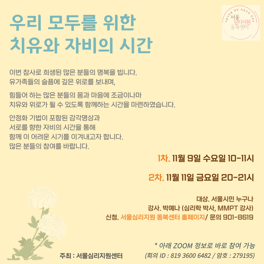 – 내용 : 마음을 안정시키는 감각명상과 자신과 타인을 위한 자비기원을 통해 심리적 불안과 우울을 완화하고 연대감을 높이는 내용