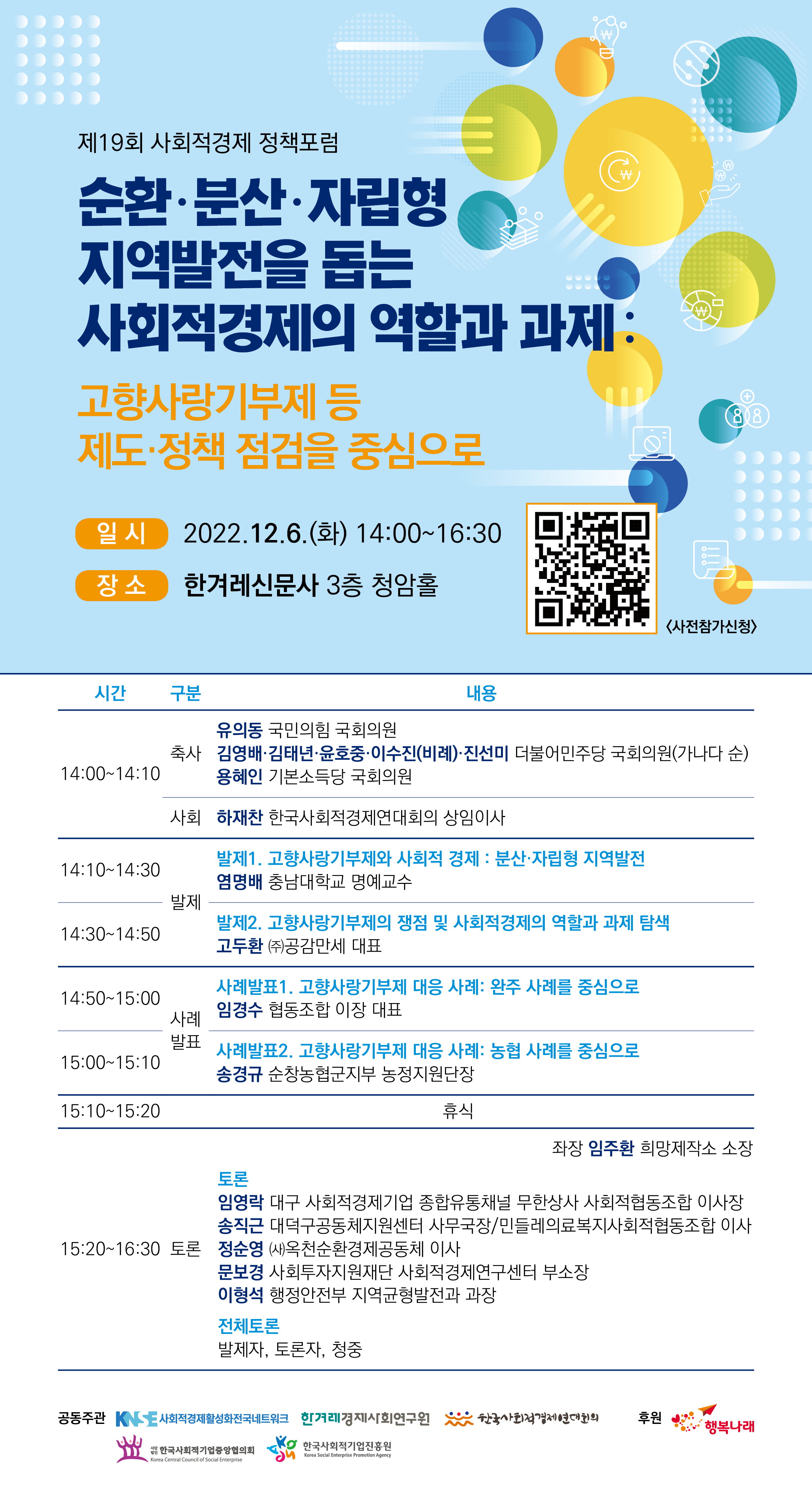 12월6일(화) 오후2시 한겨레신문사 3층 청암홀에서 ‘순환 · 분산 · 자립형 지역발전을 돕는 사회적경제의 역할과 과제: 고향사랑기부제 등 제도 · 정책 점검을 중심으로’를 주제로 <제19회 사회적경제 정책포럼>이 열립니다.