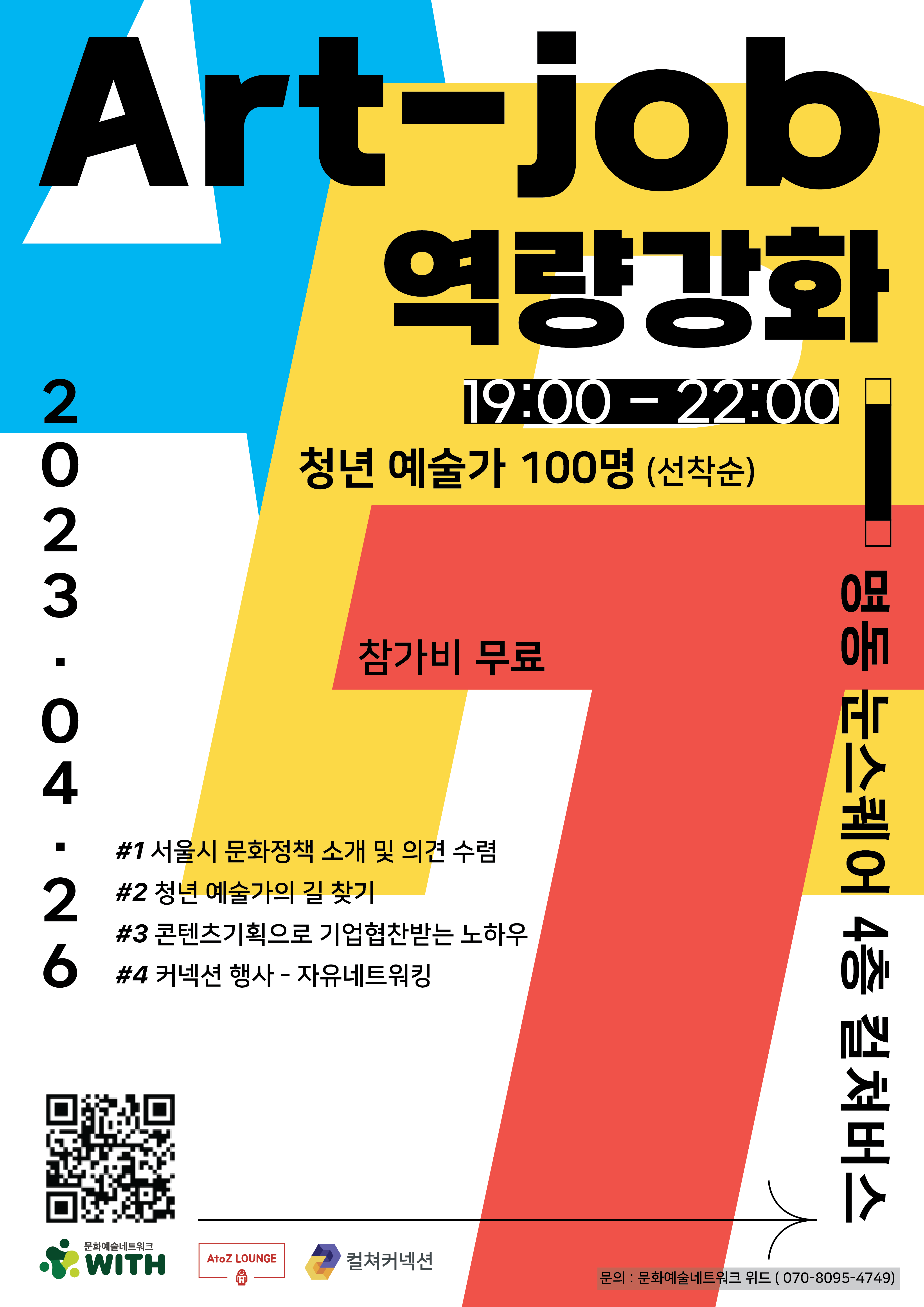 문화예술네트워크 위드와 에이투지라운지, 컬쳐커넥션이 모여 매달 문화예술분야의 필요한 교육, 네트워킹, 정책에 대한 목소리를 낼 수있는 시간을 마련했습니다! 불만이있다고 가만히 있으면 세상이 변하지 않습니다. 우리가 함께목소리내고