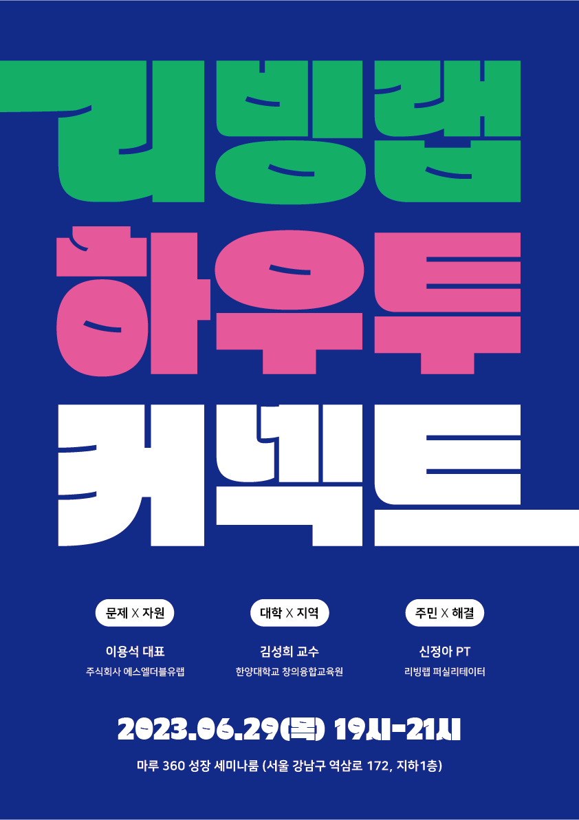 일시: 2023.06.29(목) 19:00~21:00(2시간) 장소: 마루 360 성장 세미나실 (강남구 역삼로 172, B1) 비용: 무료 저희 에스엘더블유랩은 리빙랩 운영과 혁신에 대한 아이디어를 연구하고 제공하는 회사이며, 이번 6월 29일 목요일에 준비한 세미나가 있어 알려드립니다. 포럼의 내용은 도시·지역 자원과 지역 구성원의 UX를 제대로 이해하고, 이를 바탕으로 실효성 있는 솔루션을 도출할 수 있도록 방법을 소개하고 의견을 공유하는 행사입니다. 에스엘더블유의 이용석 대표님과 현재 논산에서 도시재생 사업을 진행하고 계신 한양대 김성희 교수님, 그리고 리빙랩 퍼실리테이터로 활발하게 활동하고 계신 신정아 PT님의 강연을 무료로 들으실 수 있습니다. 지역 문제 해결 방안을 고민중이시거나, 지역 자원을 어떻게 활용하면 좋을지 등 도시 문제 및 리빙랩에 관심있는 분들이면 누구나 참여 가능하오니, 주저 말고 신청해주세요 ∇포럼 참여 신청 링크∇ https://event-us.kr/slwlab/event/63733