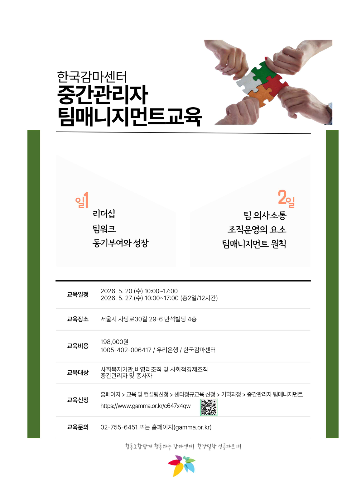 한국감마센터에서 5월에 비영리조직 중간관리자대상 [중간관리자팀매니지먼트]과정을 개설합니다.