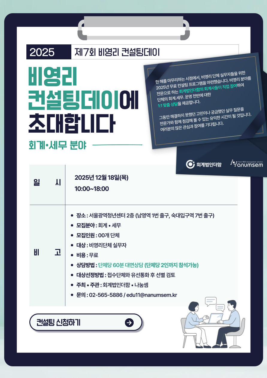 한 해를 마무리하는 시점에서, 비영리 단체 실무자들을 위한 2025년 무료 컨설팅 프로그램을 마련했습니다.