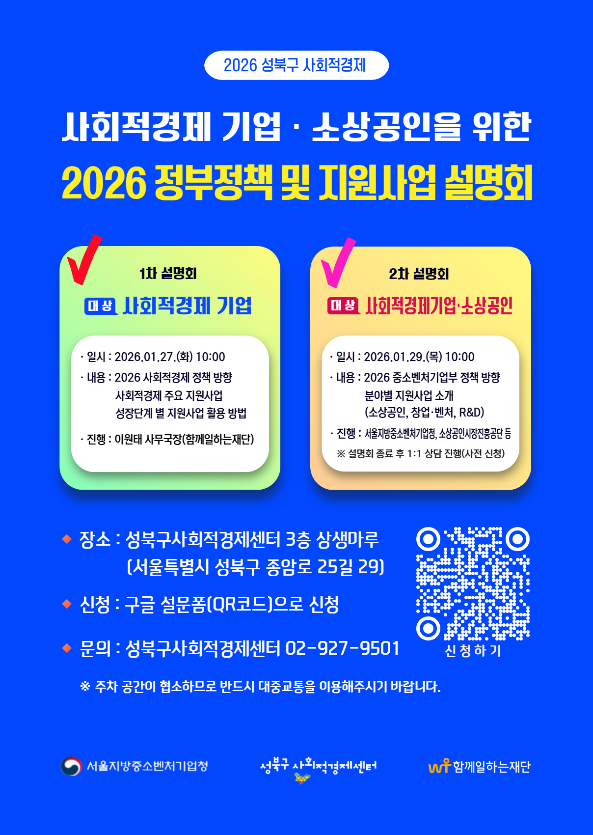 – 내용 : 2026 사회적경제 정책 및 주요 사업, 성장단계별 지원사업 활용 방법 등
