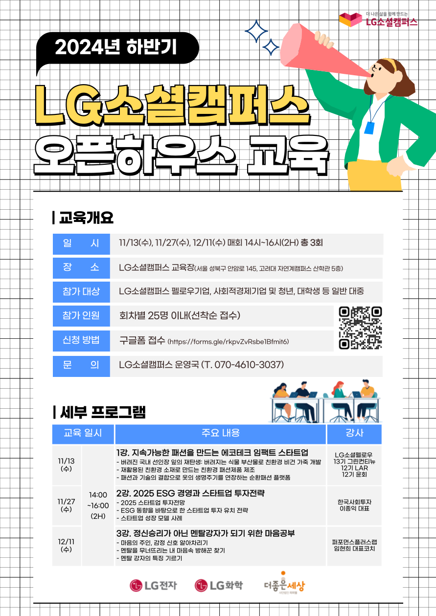 - 문의 : LG소셜캠퍼스 운영국 공간지원 담당 임예린 책임매니저(T. 070-4610-3037)