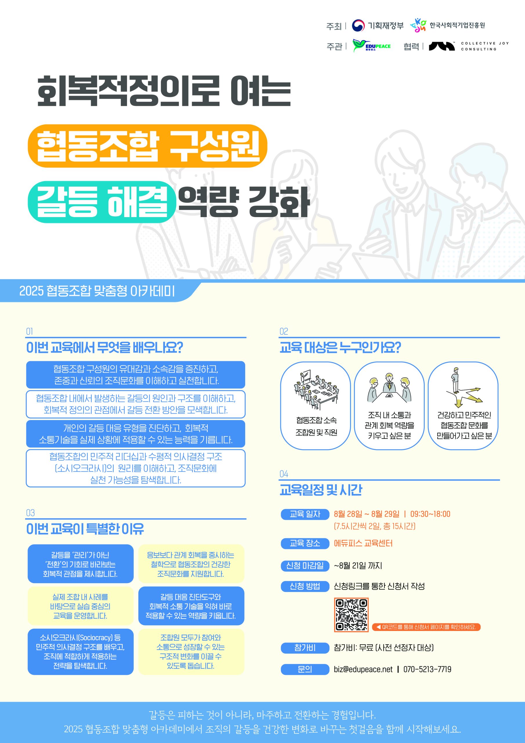 20250717 ~ 20250718 | 경기도 성남시 분당구 정자일로 27 코오롱더프라우 상가2층 208호 | 주최: 기획재정부, 한국사회적기업진흥원 | 주관: 협동조합 회복적정의 평화배움연구소 에듀피스